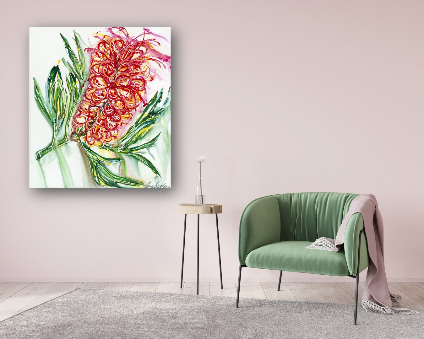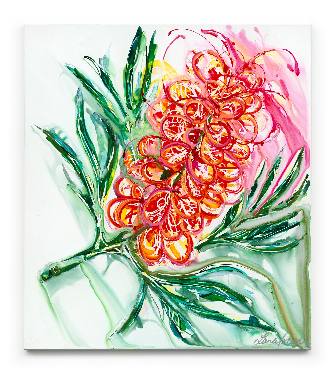 Grevillia is a large-scale abstract artwork by Lara Scolari, celebrating the sculptural beauty of Australia’s beloved Grevillia flower. Known for its intricate comb-like blooms and bold, spiky leaves, the Grevillia brings a lively texture and vibrant color to any Australian garden, attracting native birds and insects with its sweet nectar.